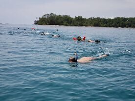 We snorkel in different places and explore the surroundings, usually two sessions of about 40 minutes each. In the water, you will follow a guide, a Cahuita native and nature specialist/tour guide, explaining the coral reef system and showing you its lush marine life.